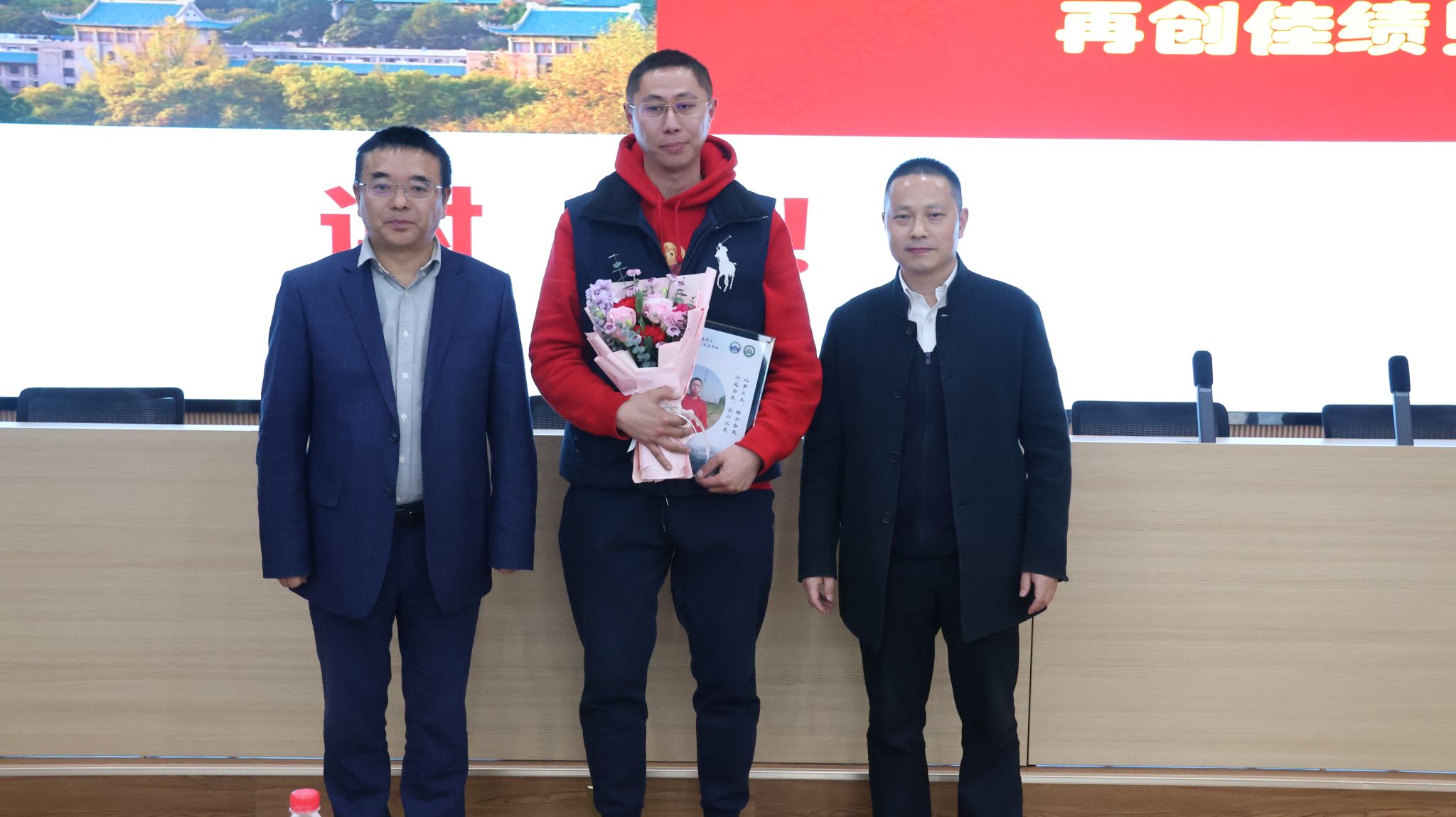 的温权教授上台亮相,表达为学院事业发展贡献力量的决心,罗永宽、张全友送上入职纪念相框和鲜花。