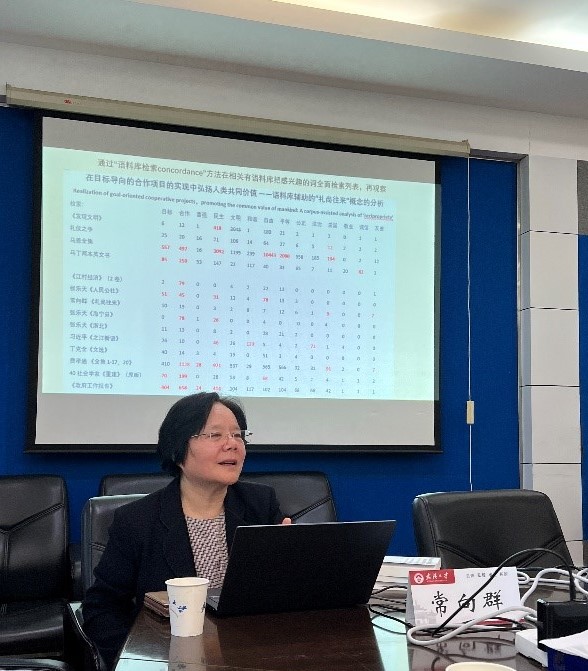接着常向群解释了什么是语料库、什么是语料库社科法和分析工具WordSmith Tools。并通过以《马克思恩格斯全集》、《费孝通全集》等语料库研究人类共同价值的具体实例展现了语料库社科法的检索行分析、搭配词分析、型式分析、词丛分析、主题词分析、词频功能与搭配网络分析等方法,认为语料库对大规模电子文本的处理和分析、发现问题、证实与证伪猜测、可提供研究问题的框架和指明具体深入研究方向等都有较大的帮助作用。