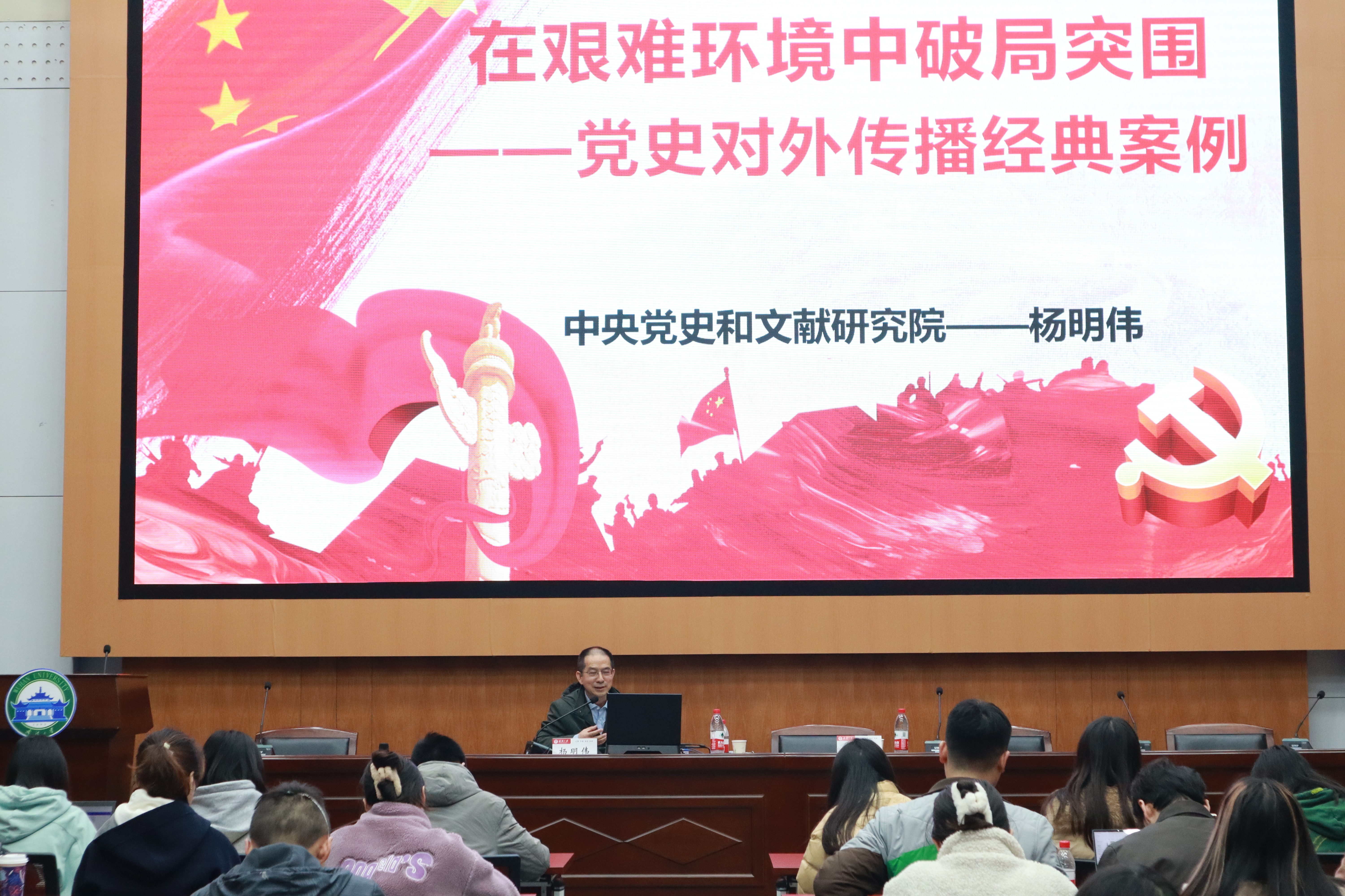 杨明伟研究员围绕怎样在艰难环境中破局突围的主题,以新中国成立之前的历史为切入点,重点阐释了1930年代和延安时期党对外传播的经典案例,为在场师生带来了一场内容丰满的精彩讲座。